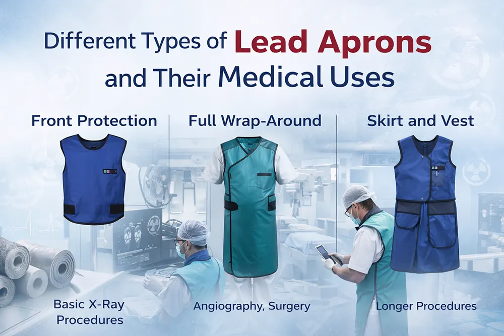 Lead aprons alag-alag types ke hote hain jaise front protection, full wrap aur skirt-vest design. Har type ka use different medical procedures ke liye hota hai.