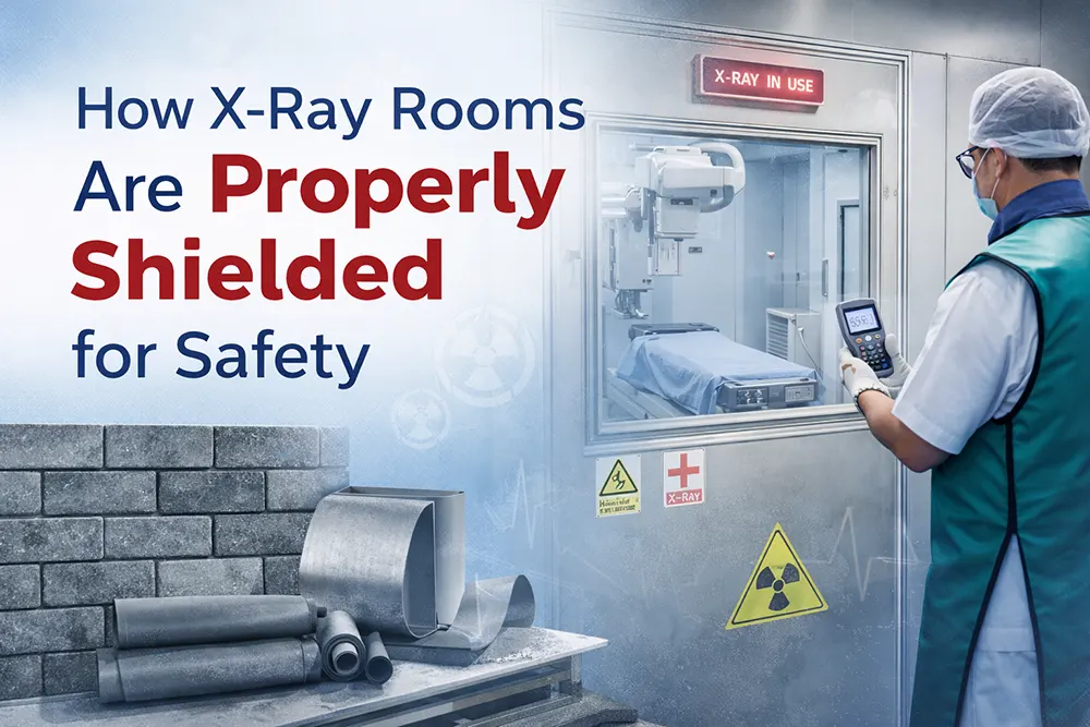 X-ray rooms mein lead lining aur shielding panels use kiye jaate hain taaki radiation leakage ko roka ja sake aur surrounding areas safe rahein.